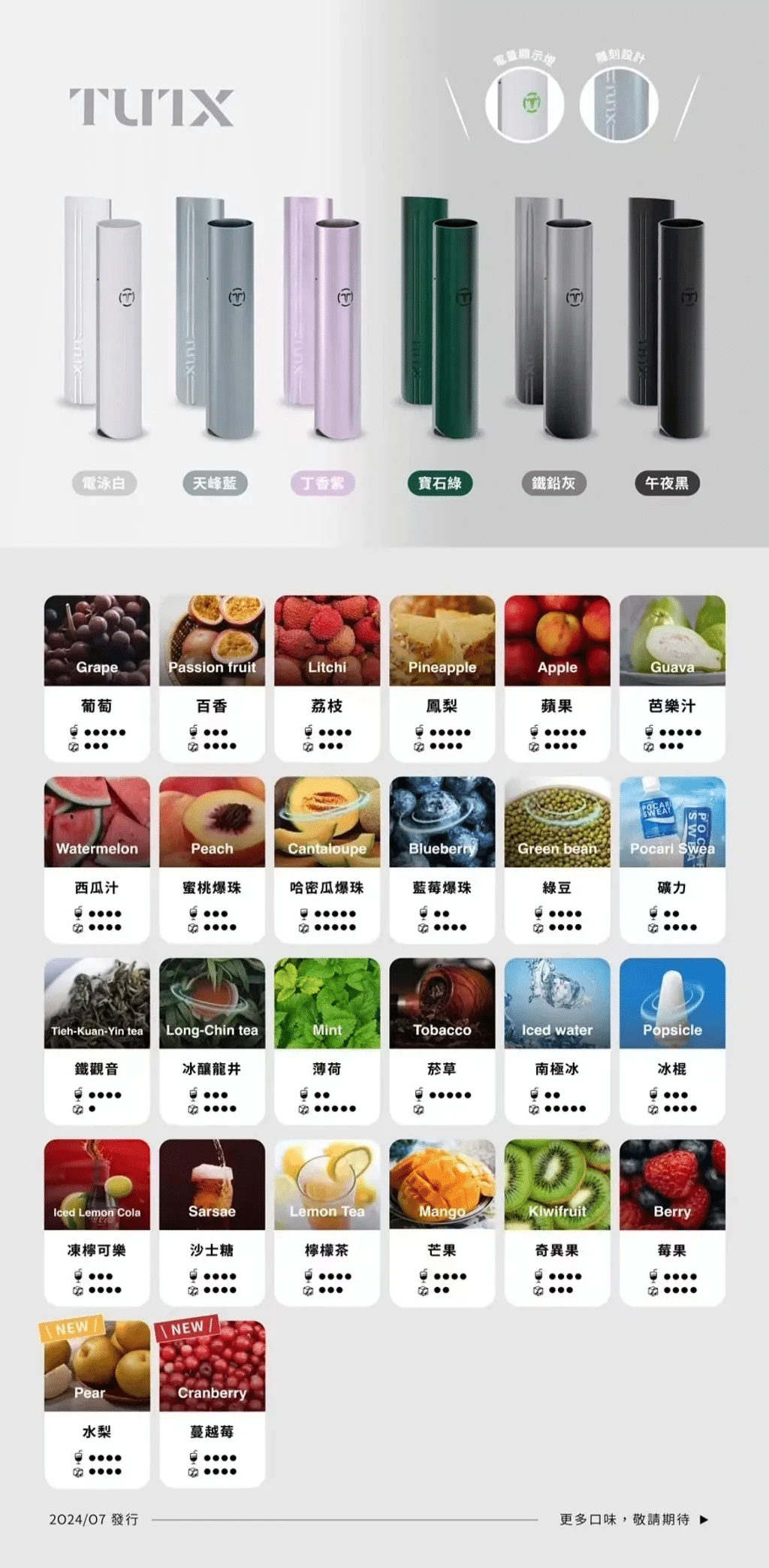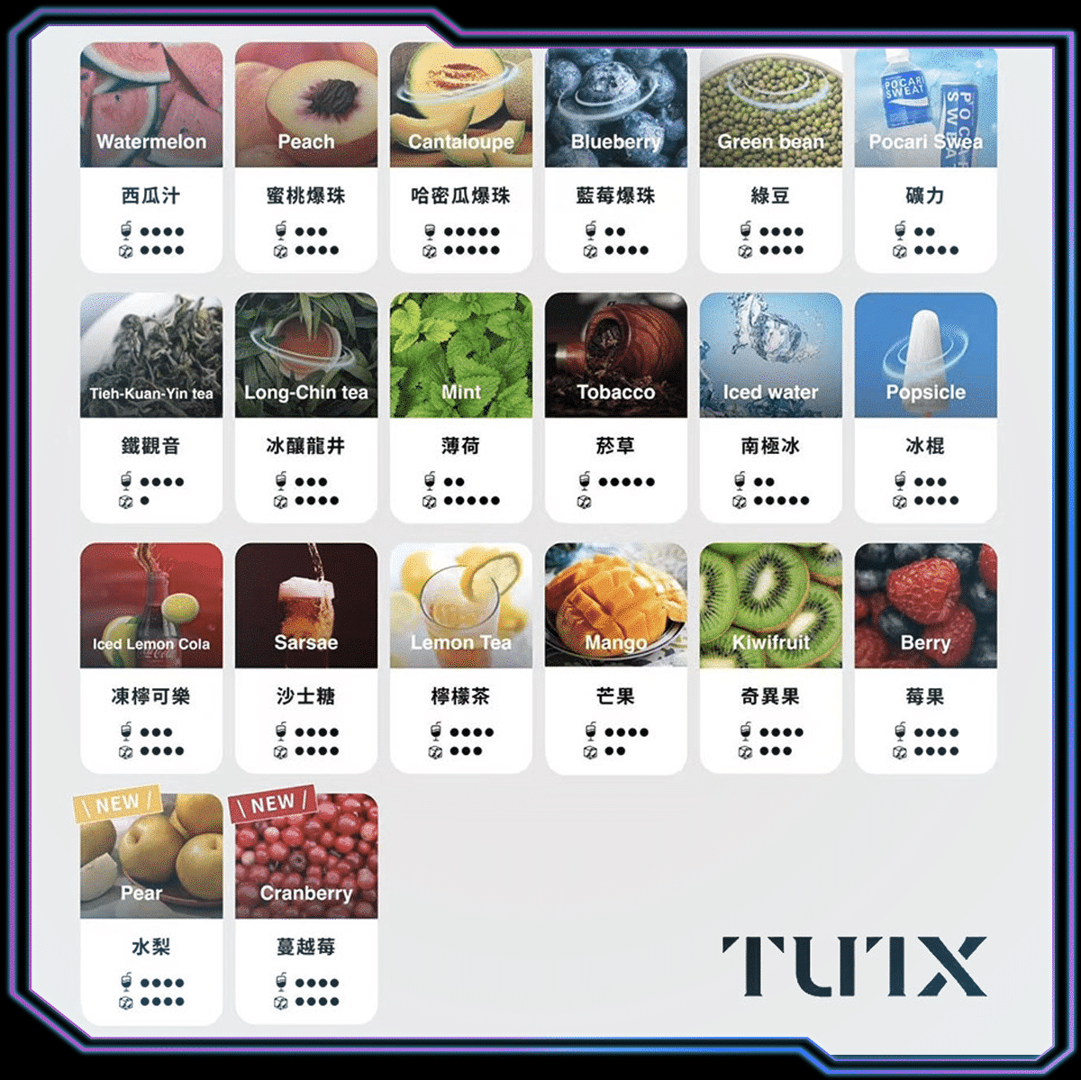 葡萄 ,百香果 ,荔枝 ,鳳梨 ,蘋果 ,芭樂汁 ,西瓜汁 ,蜜桃爆珠 ,哈密瓜爆珠 ,藍莓爆珠 ,綠豆 ,寶礦力 ,鐵觀音 ,冰釀龍井 ,薄荷 ,菸草 ,南極冰 ,冰棍 ,凍檸可樂 ,沙士糖 ,檸檬茶 ,芒果 ,奇異果 ,莓果 ,水梨 ,蔓越莓 |